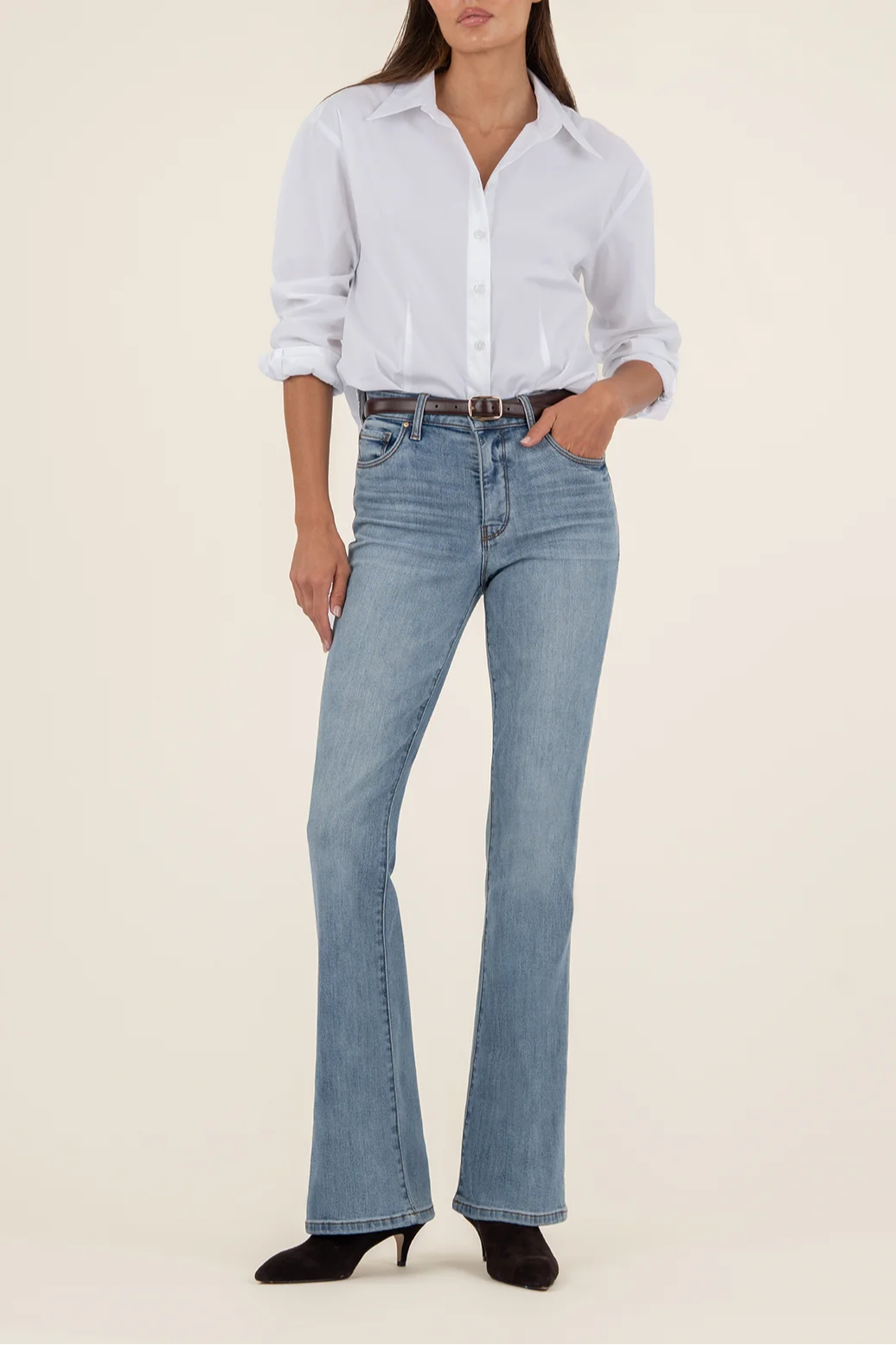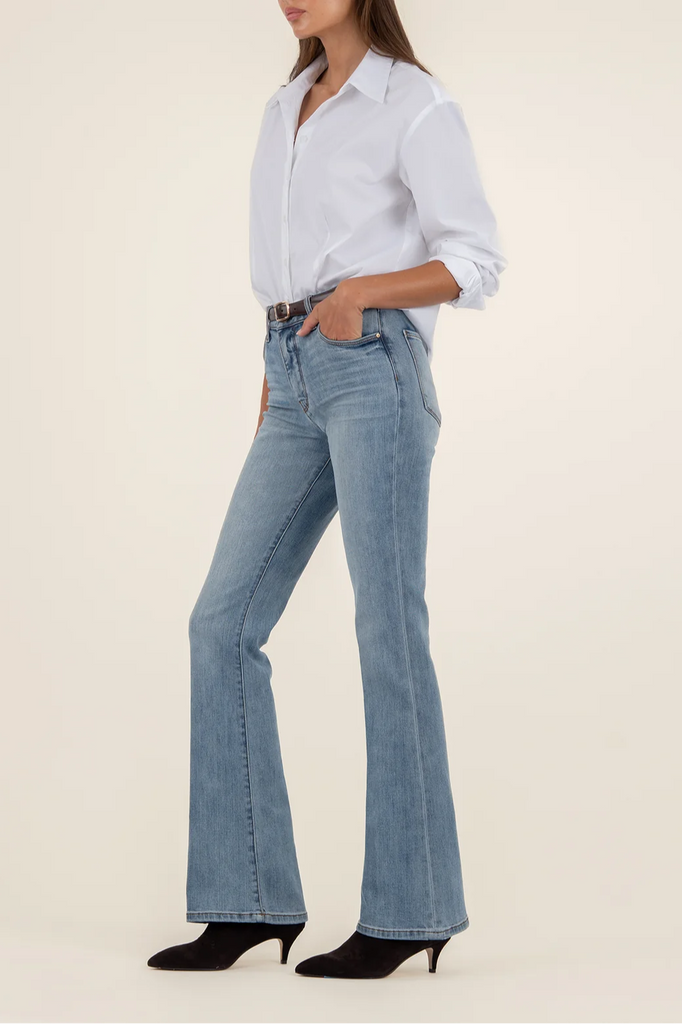 Elevate your style with these high-rise flare pants featuring Fab Ab fit for a flattering silhouette. Crafted in a medium wash with very stretchy material, they offer all-day comfort and a sleek, trendy look. Perfect for dressing up or down, these pants are a versatile wardrobe essential.