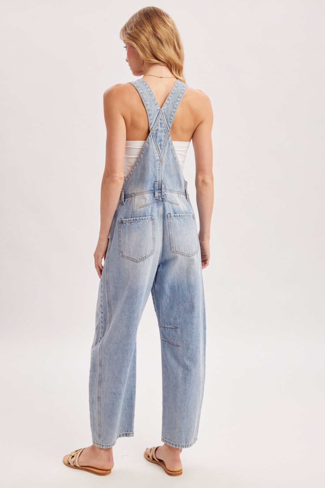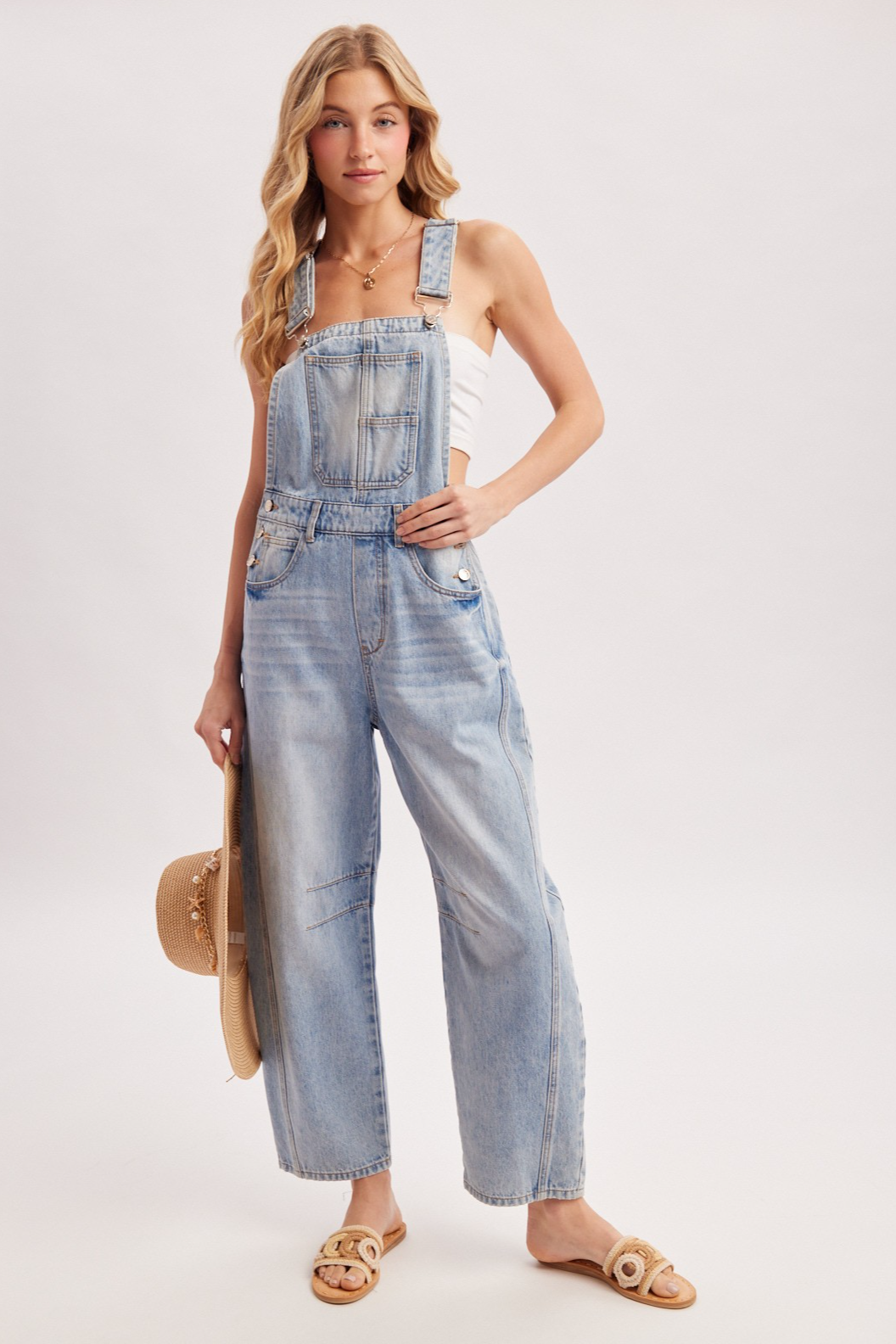 Denim barrel overalls offer a modern twist on the classic overall design, featuring a relaxed, wide-leg silhouette that provides both style and comfort. The barrel shape of the legs creates a unique, voluminous look, while the adjustable straps and bib front maintain the traditional overall aesthetic. Made from sturdy denim, these overalls are designed for durability and casual wear. Functional pockets add practicality, making them perfect for everyday outfits. These versatile overalls can be dressed up with a fitted top or kept casual with a simple tee for a laid-back, stylish vibe.