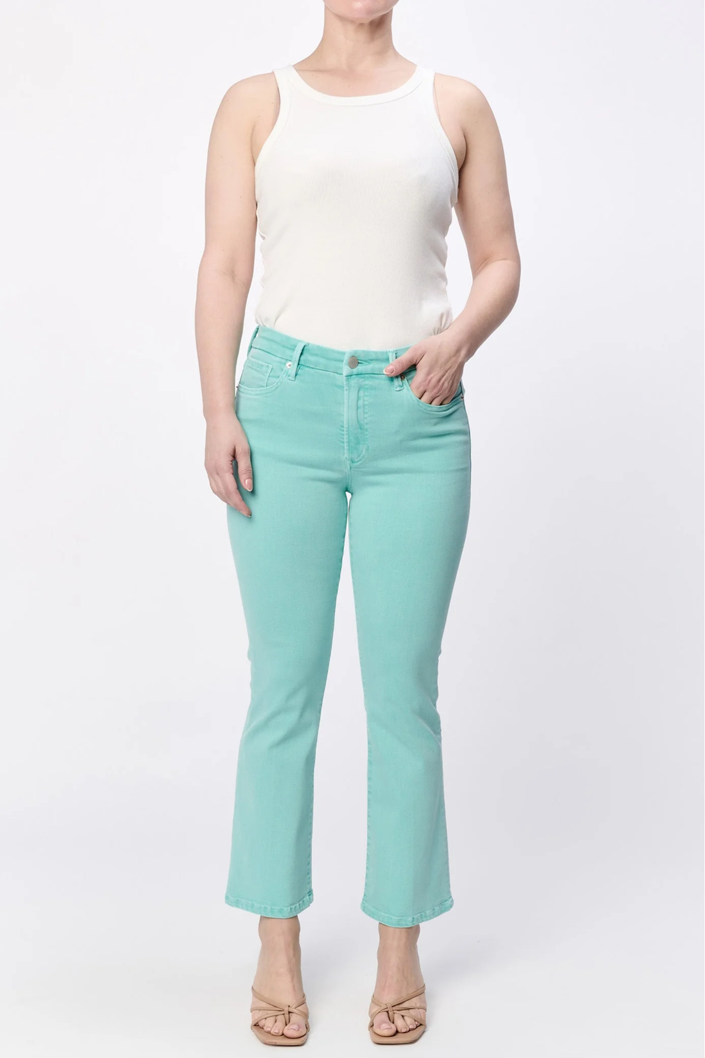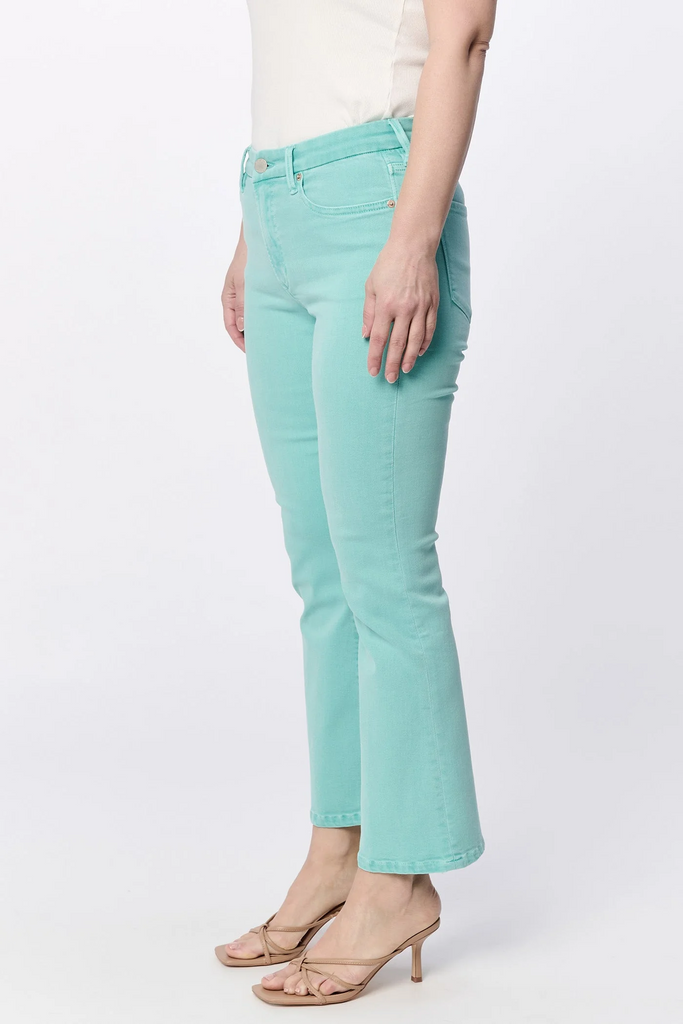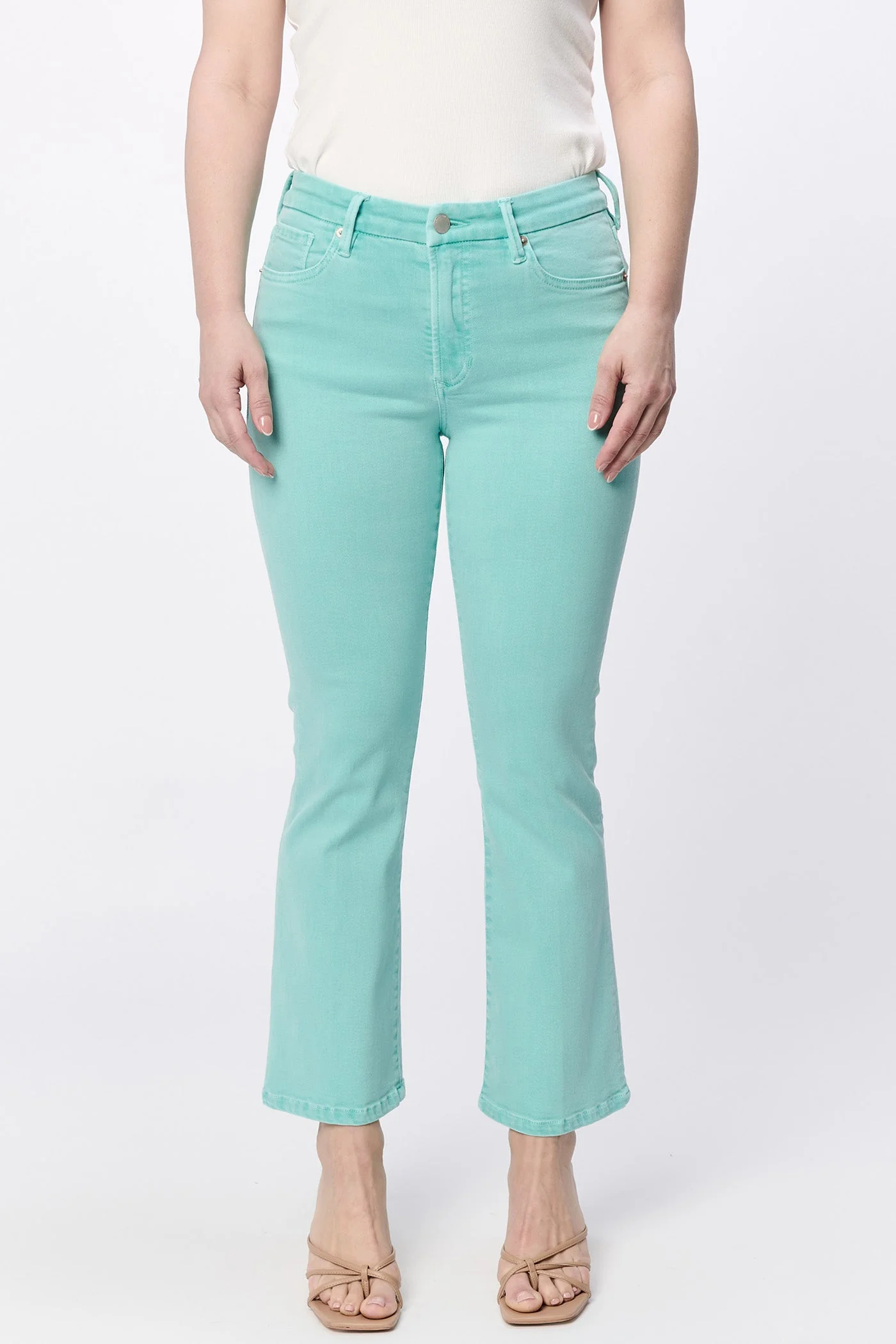 Refined elegance with the Jeanne flare jeans in designer colors, featuring a mid-rise fit and fray hem for an effortlessly chic look.