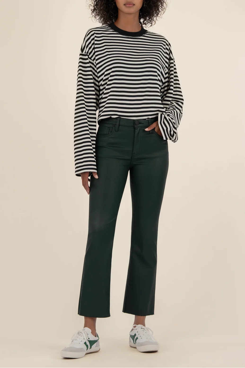 These high-rise ankle flare pants are crafted from sleek matte coated material that adds a fabulous, modern edge to any outfit. Perfect to dress up or down, they offer a versatile style that transitions effortlessly from day to night. Elevate your wardrobe with these statement-making pants that combine comfort and bold sophistication.