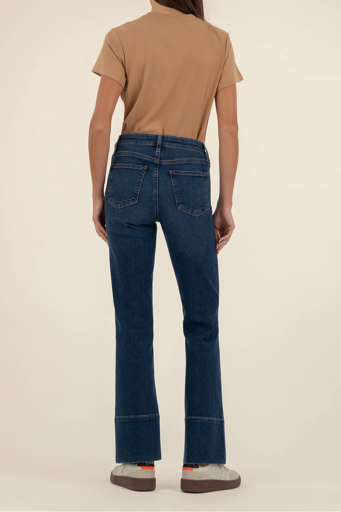 Elevate your look with these high-rise ankle flare jeans in a rich dark wash. Designed with a wide hem and striking front seams, they feature our signature Fab Ab pockets and a touch of stretch for comfort and flattering fit.