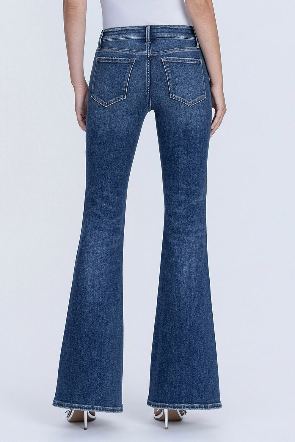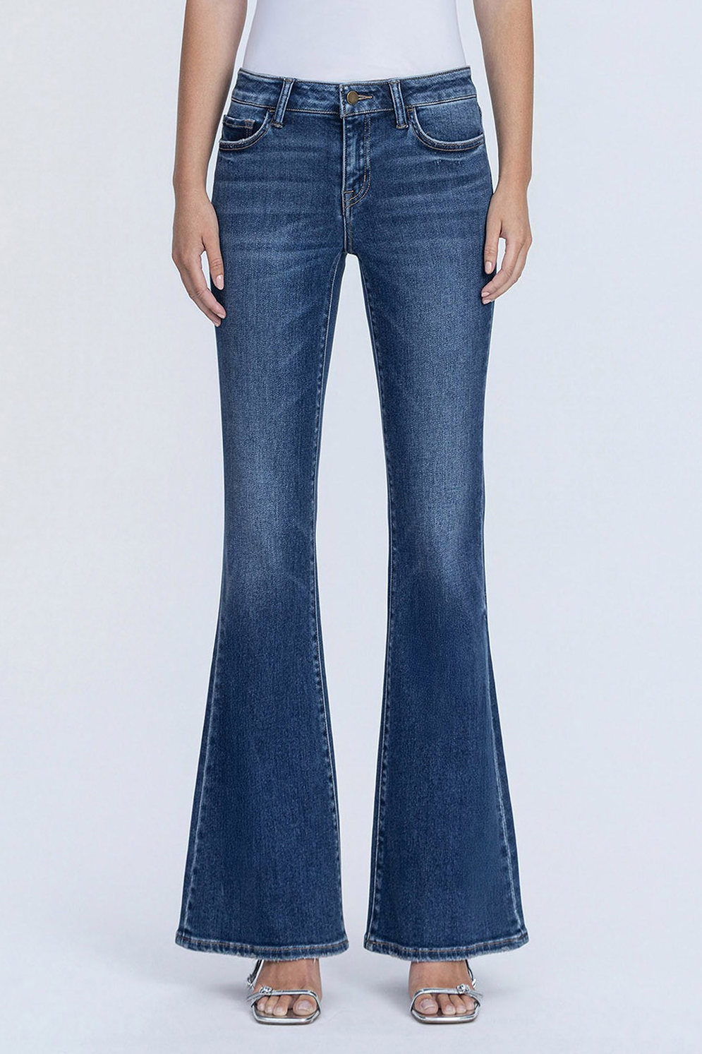 COMFORT STRETCH DENIM, LOW RISE WAIST, 5 POCKETS, FINISHED HEM, FULL LENGTH, DARK WASH, EASY FLARE JEANS