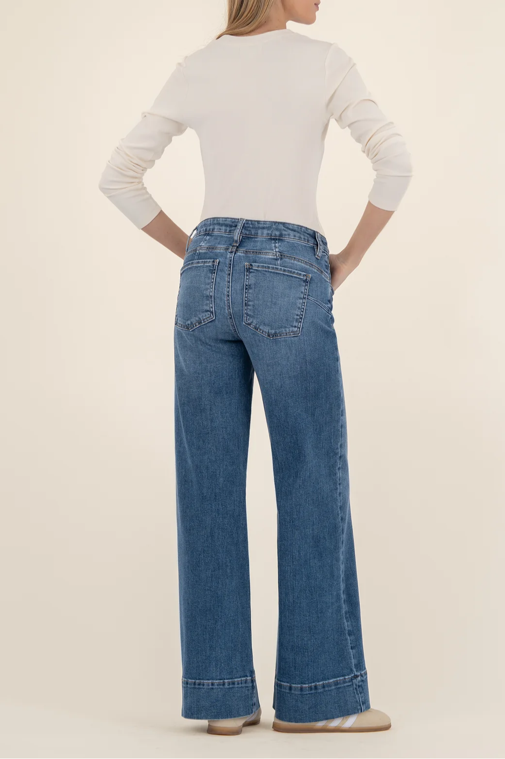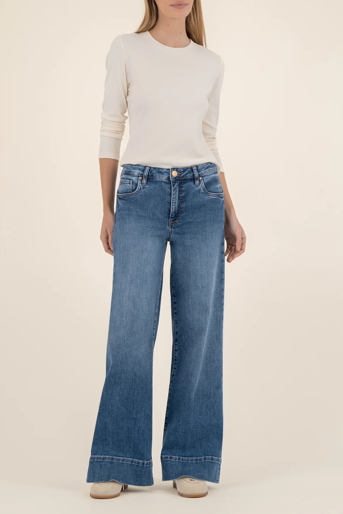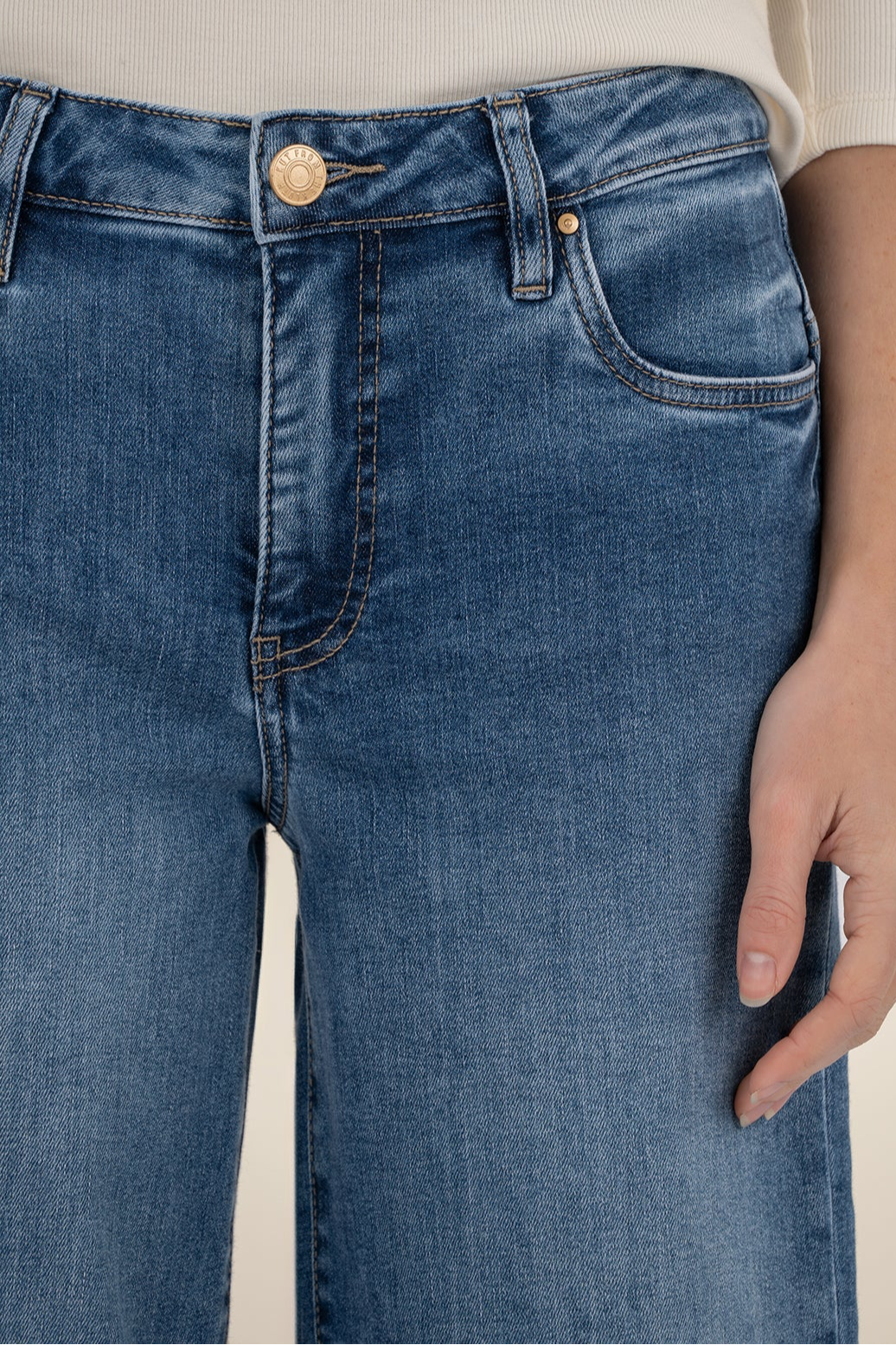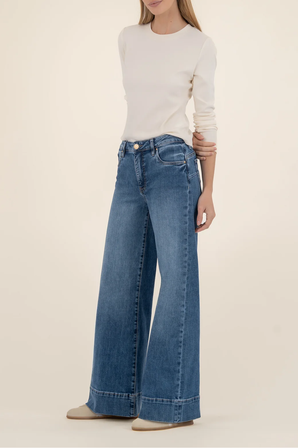 These high-rise wide leg jeans strike the perfect balance between structure and comfort. Designed in a classic medium wash with a bold wide hem, they bring an effortlessly polished feel to any look. Fab Ab pockets offer subtle shaping, while the stretchy material keeps the fit easy and flattering all day long.