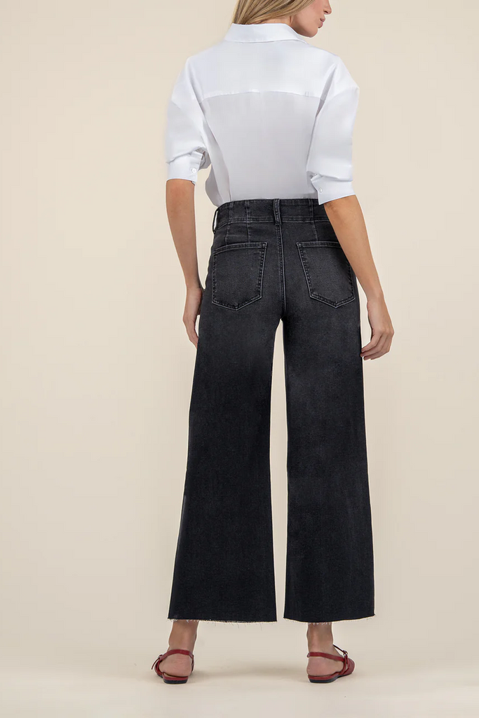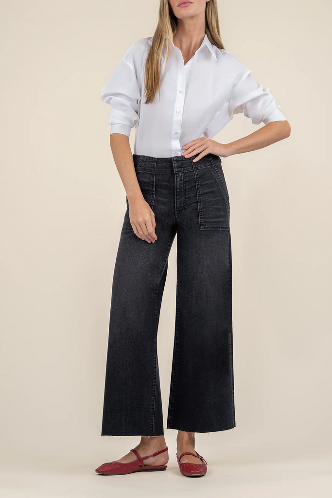 Inspired by '70s styles, these wide leg jeans are remade for today in supersoft stretch denim with raw hems and a relaxed fit through the legs.