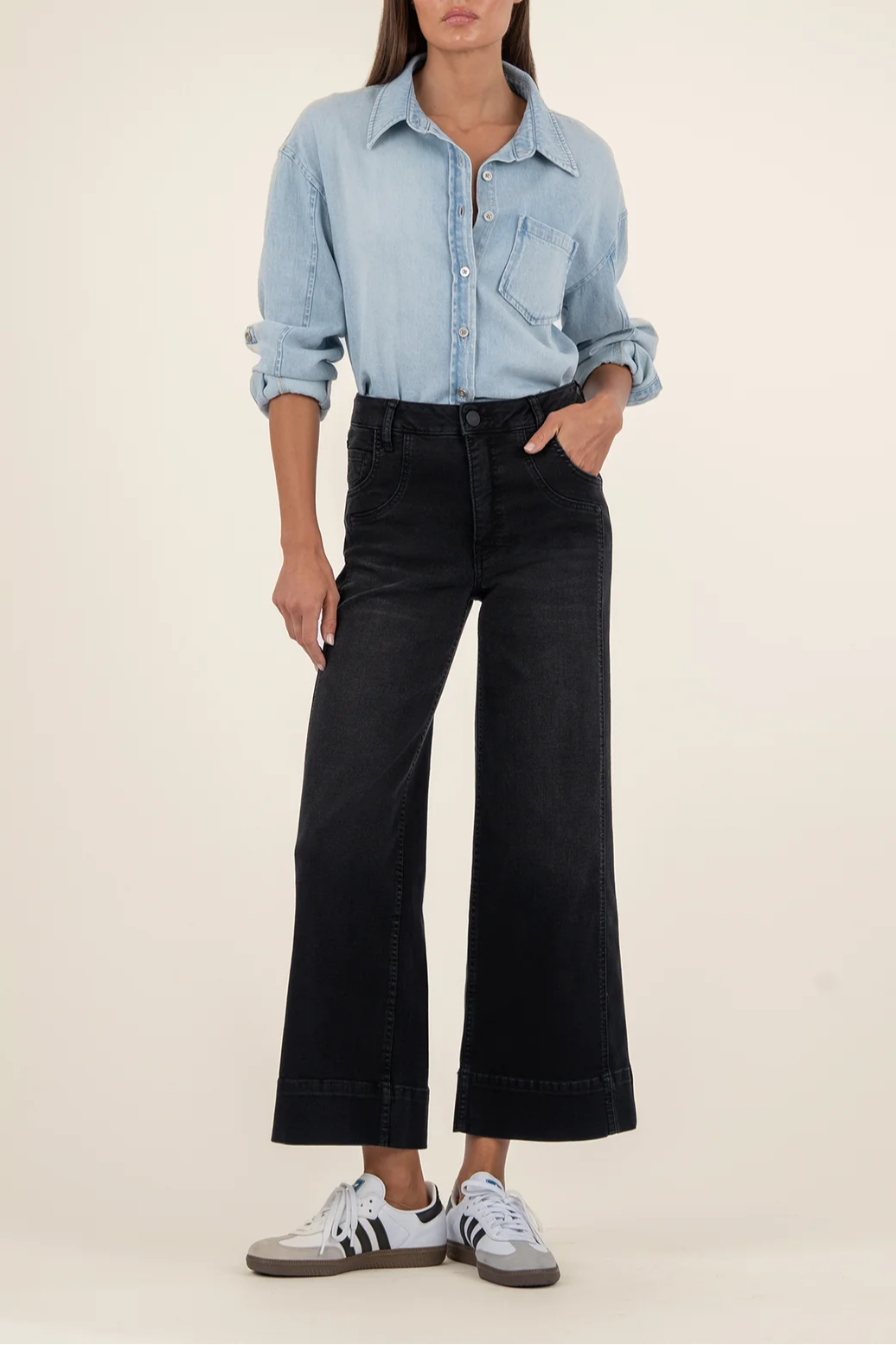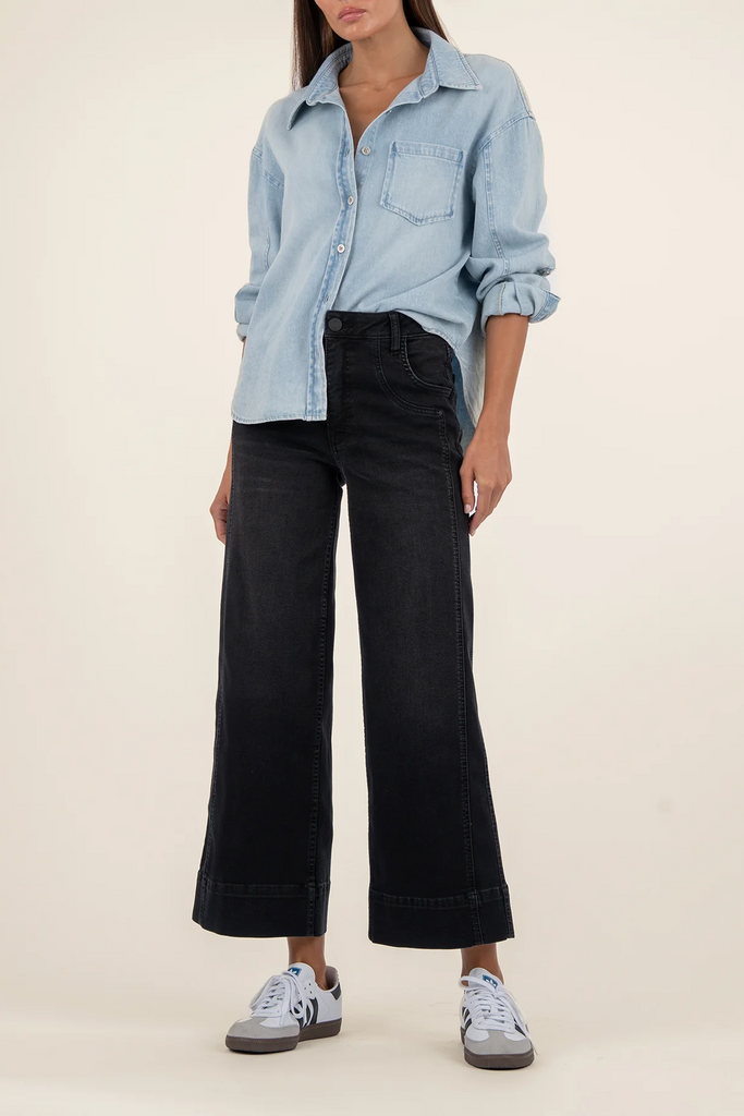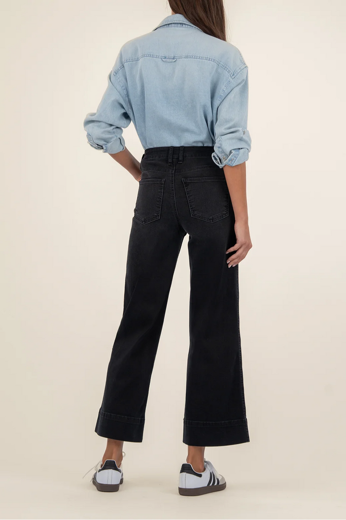 Designed to flatter, these high-rise wide leg jeans come in a sleek black wash and are made from a soft, stretchy material for ultimate comfort. Featuring Fab Ab pockets, double front pockets, and a wide hem, they offer a modern silhouette with just the right amount of structure and style.