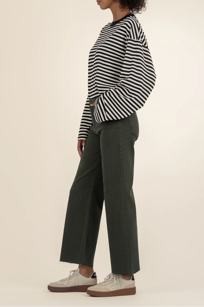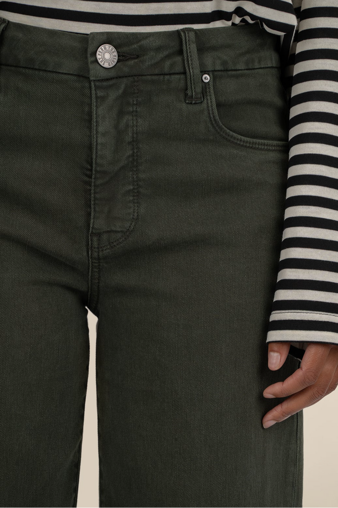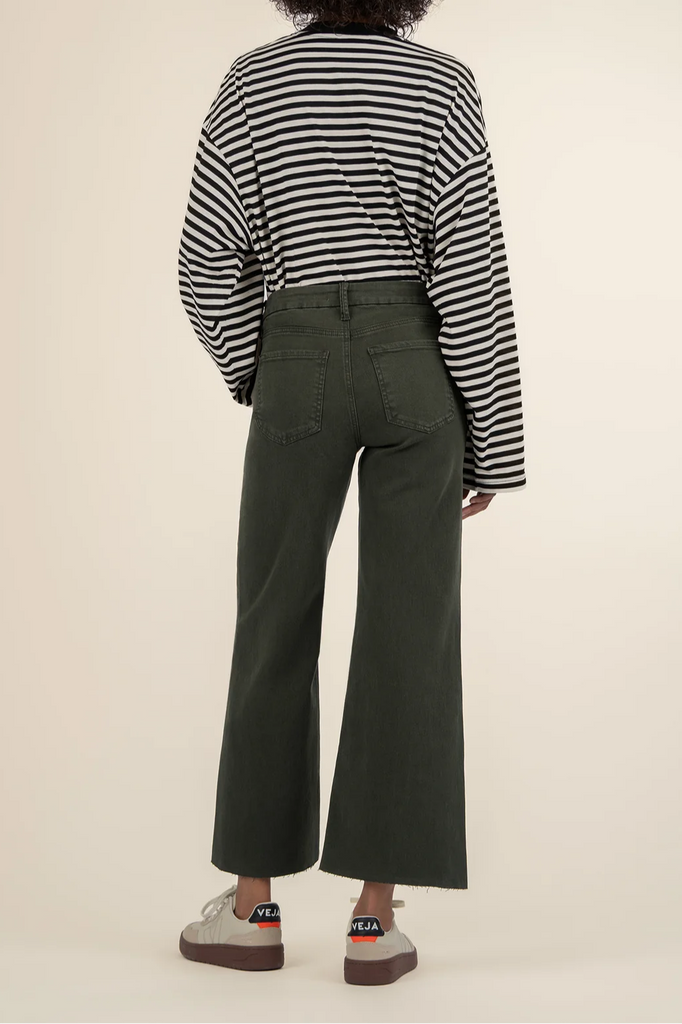 These high rise wide leg jeans feature our signature Fab Ab pockets for a flattering fit. Made with super stretchy fabric and finished with a trendy raw hem, they combine comfort and modern style effortlessly.