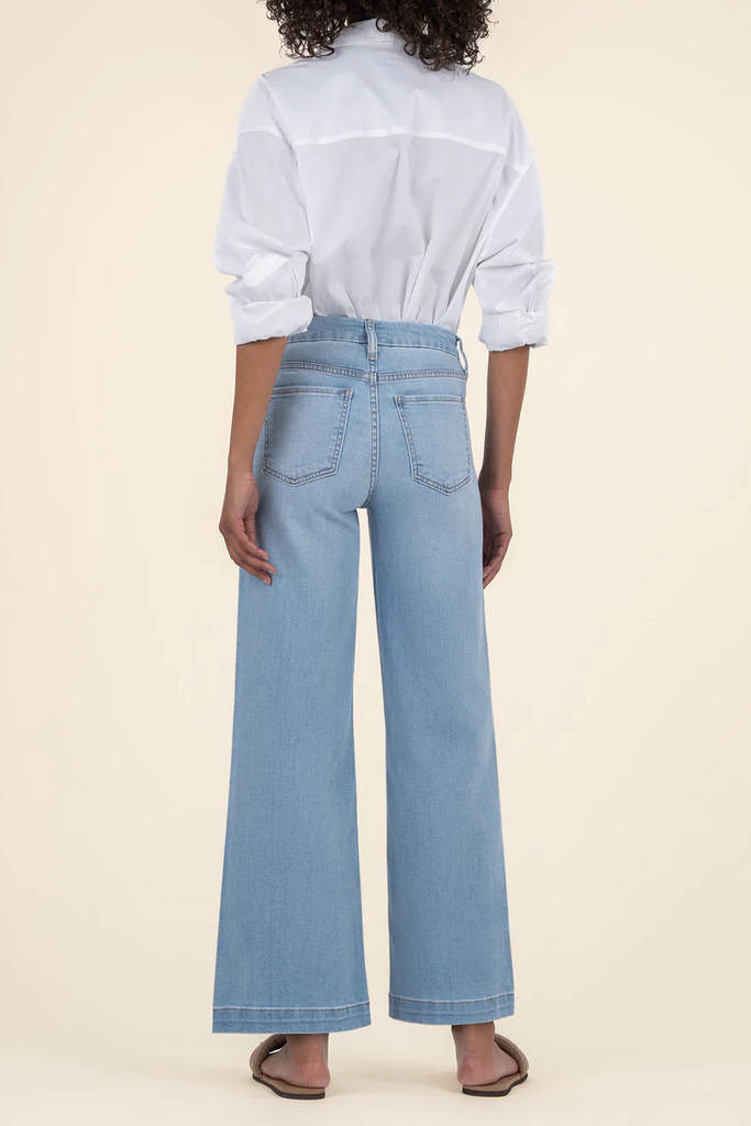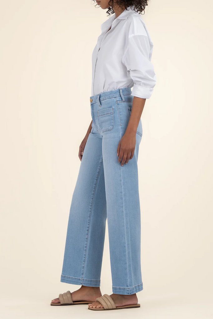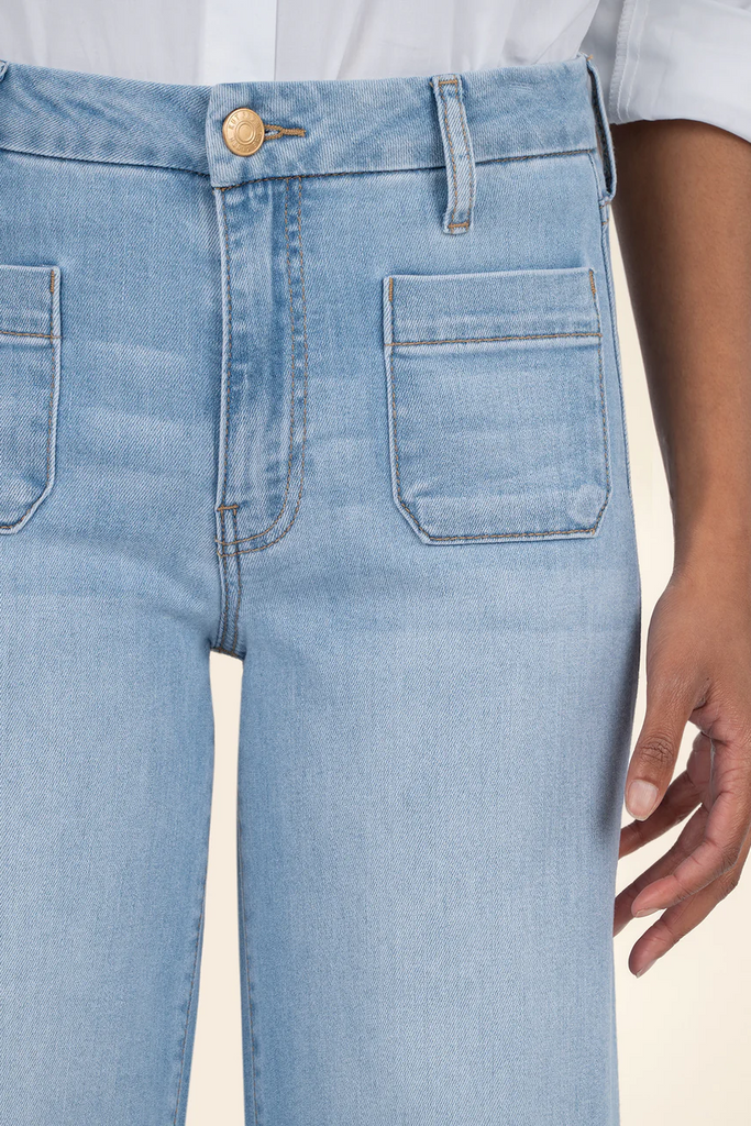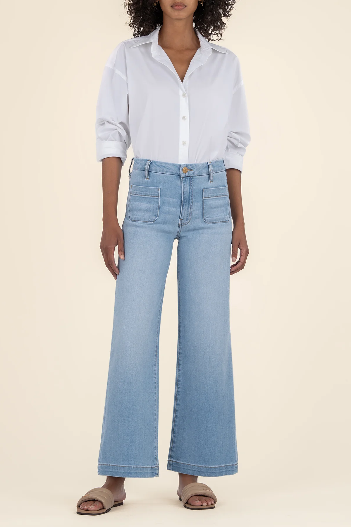 These pants feature a flattering high rise and bold, dramatic wide legs that give them a striking, retro style. The addition of patch pockets adds both functionality and flair. Perfect for making a fashion-forward statement with vintage-inspired charm.