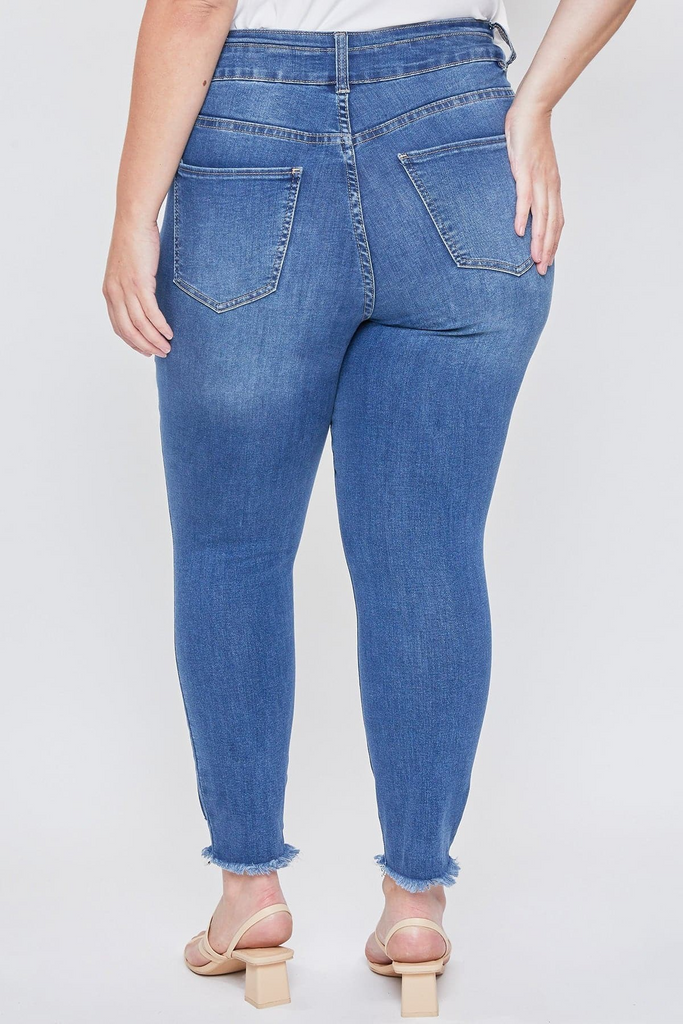 Keep up with the trends in our Women's Plus Essential 2-Button Seamed Waistband Fray Hem Ankle Jean. This high-rise ankle jean is everything you are looking for in a weekend jean. Featuring front whiskering, tasteful distressing, and destructed hems for a perfectly lived-in effect. We’ve also added a trendy 2-button closure for a unique look! This jean hits at the ankle, allowing you to flaunt your favorite shoes at the moment! Pair these with a tee, cardigan, and booties!