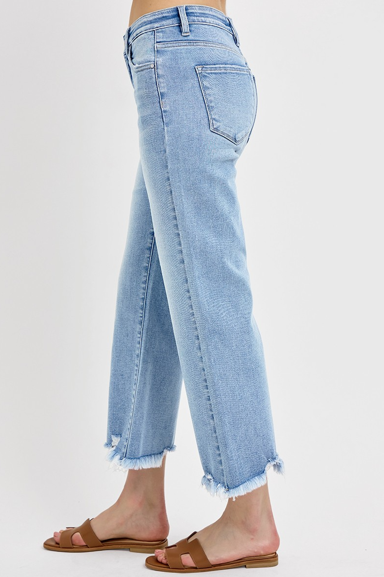 These Plus Size Mid Rise Crop Straight Jeans are a laid-back denim staple with a flattering mid rise and a cropped straight leg. Risen Jeans crafted this pair in light indigo denim with a raw, frayed hem for an effortless, lived-in look. The cut offers room through the hip and thigh while maintaining a clean, straight silhouette to the ankle. Pair them with sandals or sneakers for easy everyday wear.