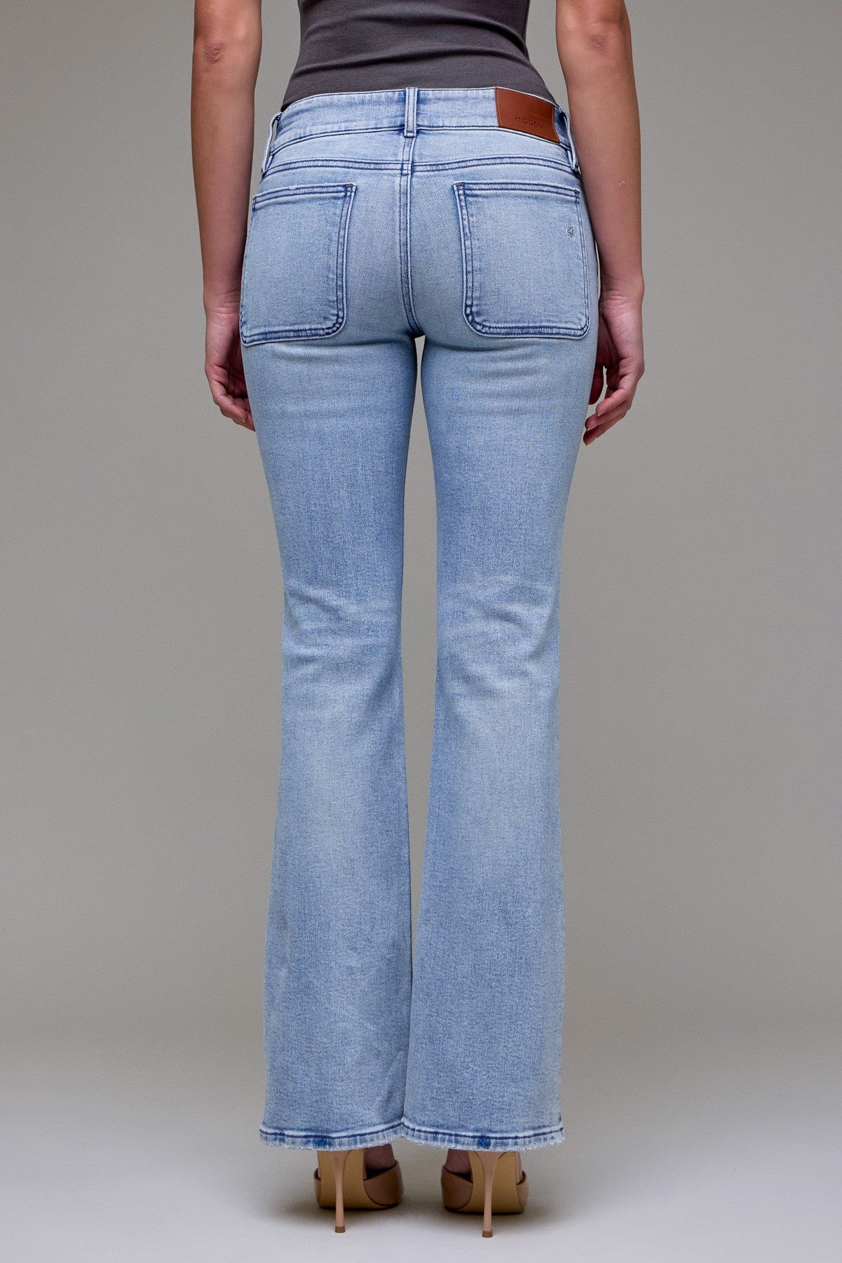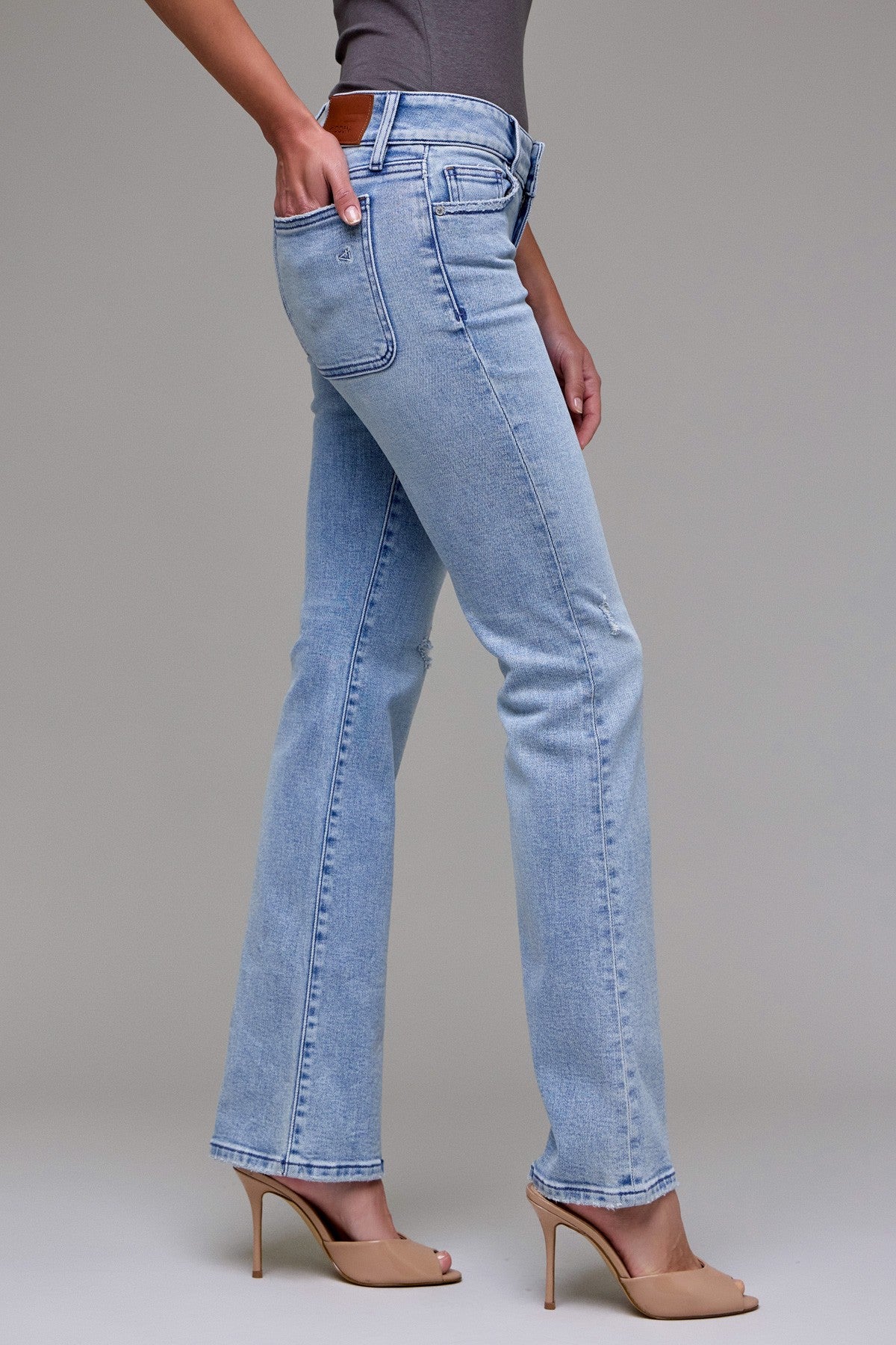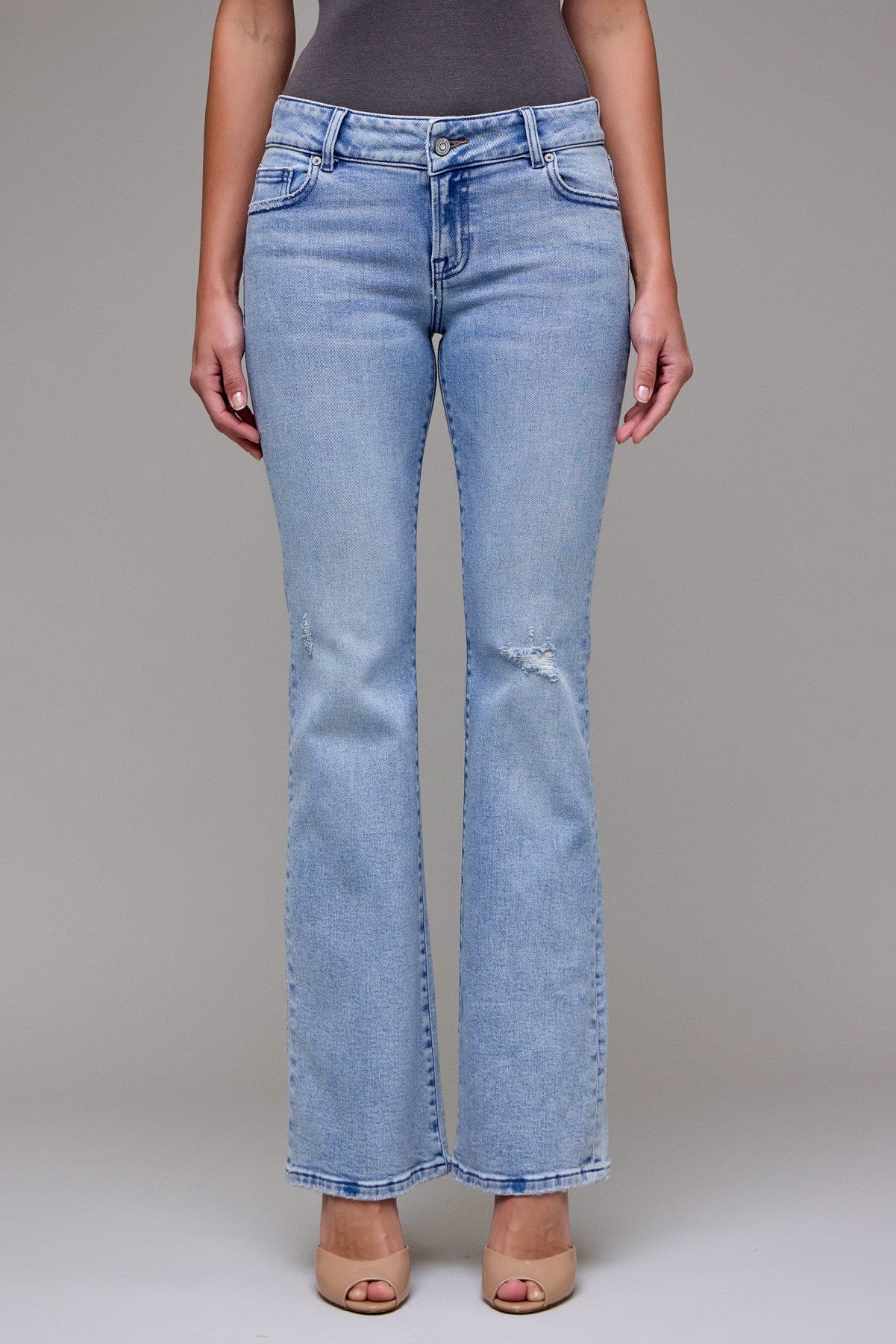 A classic bootcut silhouette with a low-rise waist and light wash denim detailing. The Ryan Low Rise Bootcut Jeans feature subtle knee distressing and a fitted hip through the thigh that opens into a gentle flare. Styled here with a tucked tank, these jeans read casual and versatile for everyday wear. HIDDEN balances contemporary fit with vintage-inspired wash for an easygoing wardrobe staple.