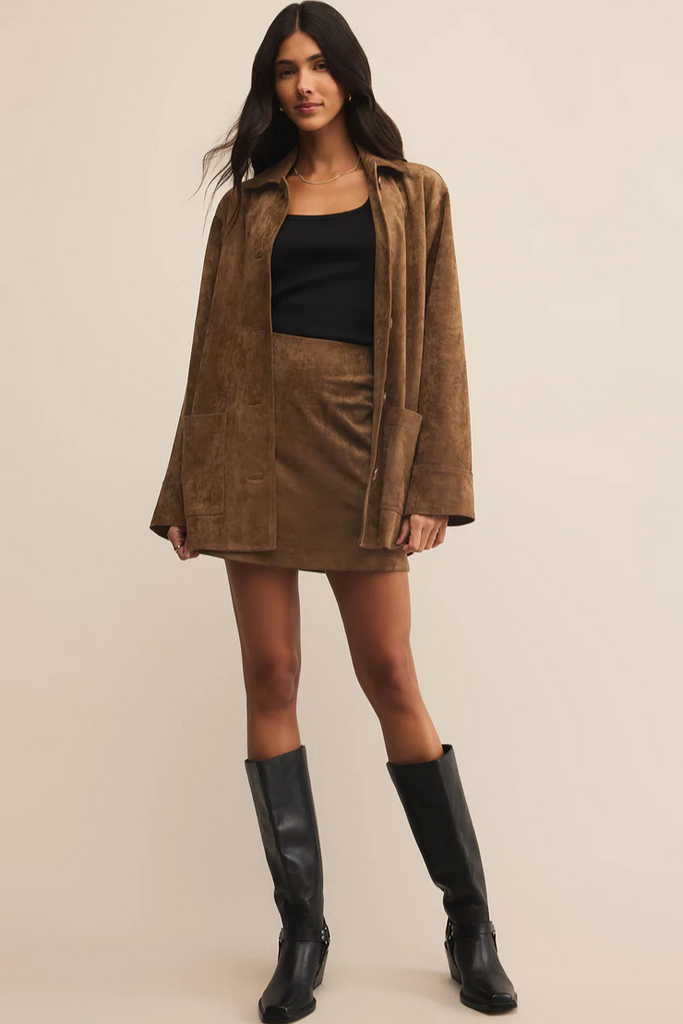 Buttery soft, perfectly tailored. This faux suede mini hugs just right with a clean zip-back design, made to pair with your coziest sweaters and favorite boots.
