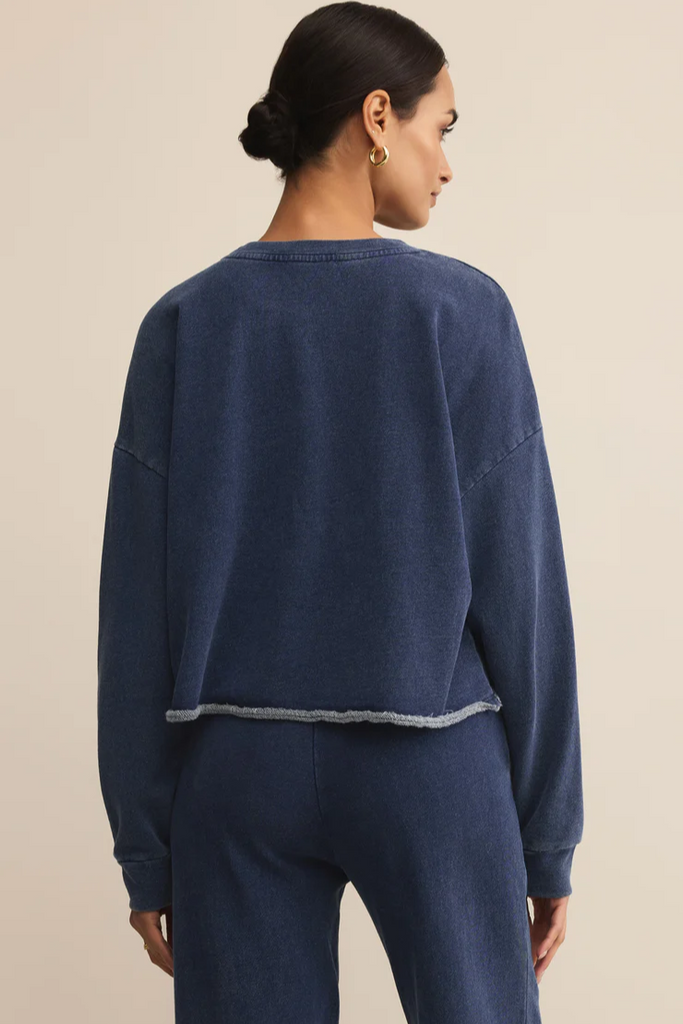 Your off-duty uniform just got a chic upgrade. Crafted from knit denim French terry with a lived-in mineral wash, this relaxed crew has that just-right slouch and an edge of raw hem detailing—perfect for layering over leggings or pairing with matching bottoms.