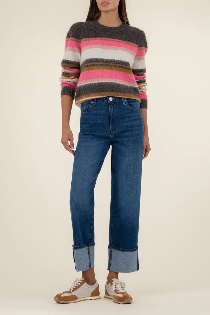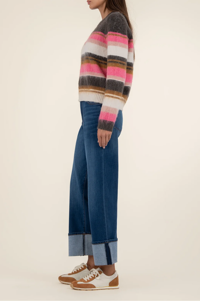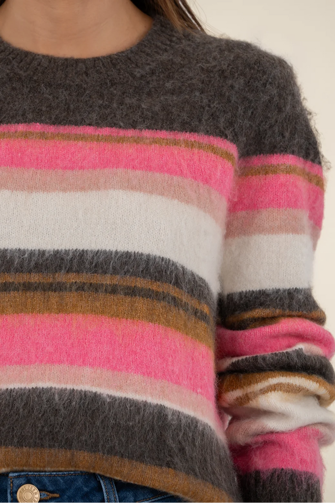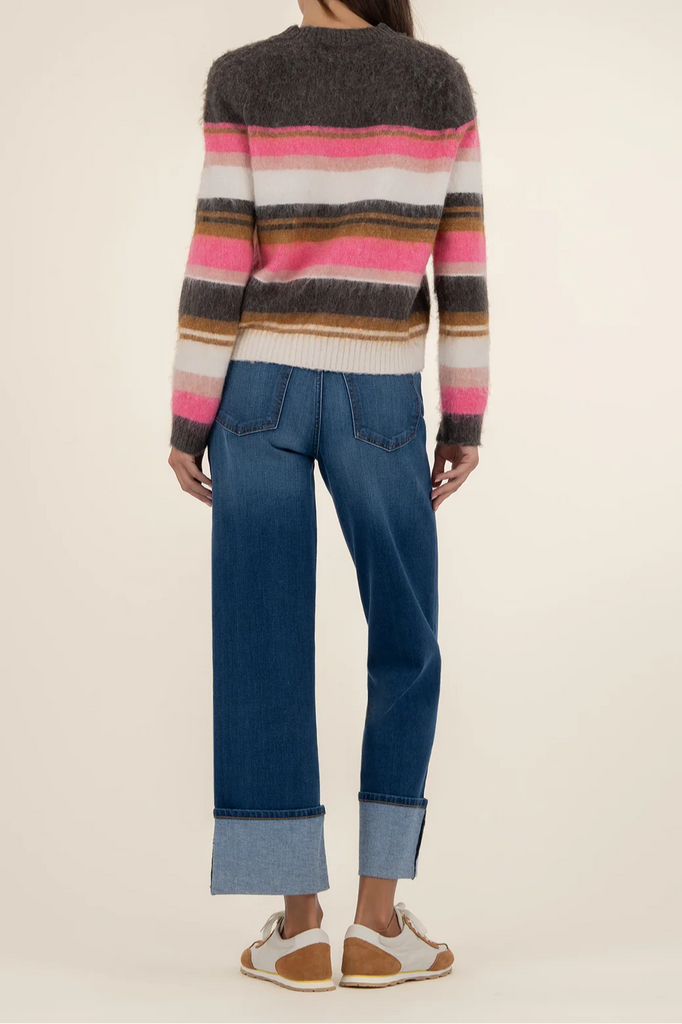 Stay cozy in this striped pullover sweater, crafted from fuzzy, soft material for all-day comfort. With its relaxed fit and casual vibe, it’s the perfect throw-on piece for effortless everyday style.