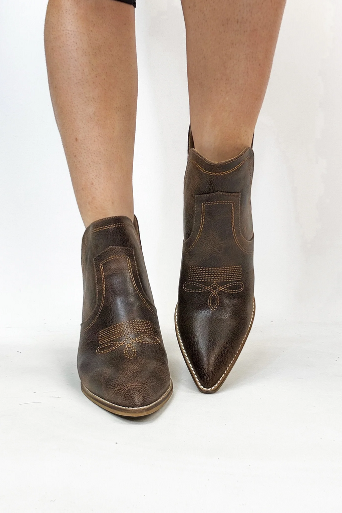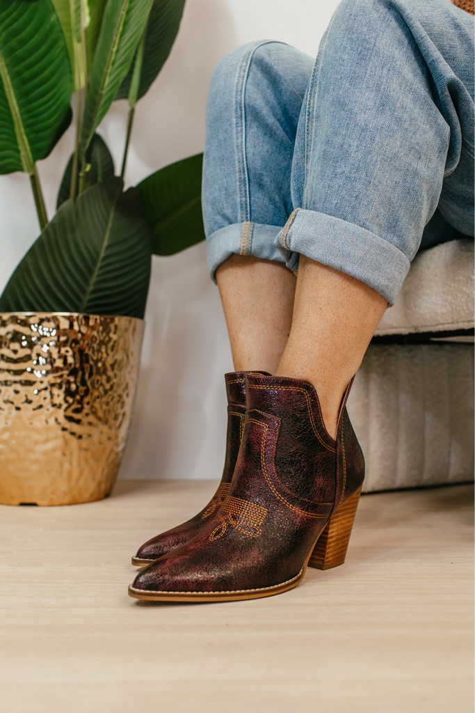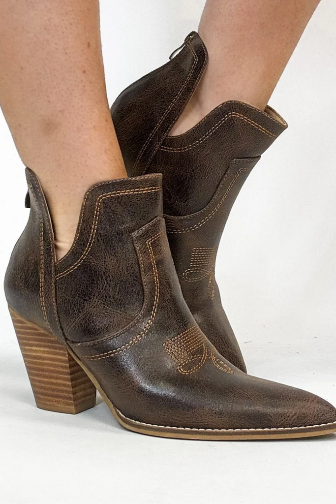 Meet your go-to bootie for bold, rustic style. This western-inspired ankle boot features distressed brown leather and classic stitching that pairs effortlessly with denim, dresses, or skirts. Easy to zip on and made to turn heads.