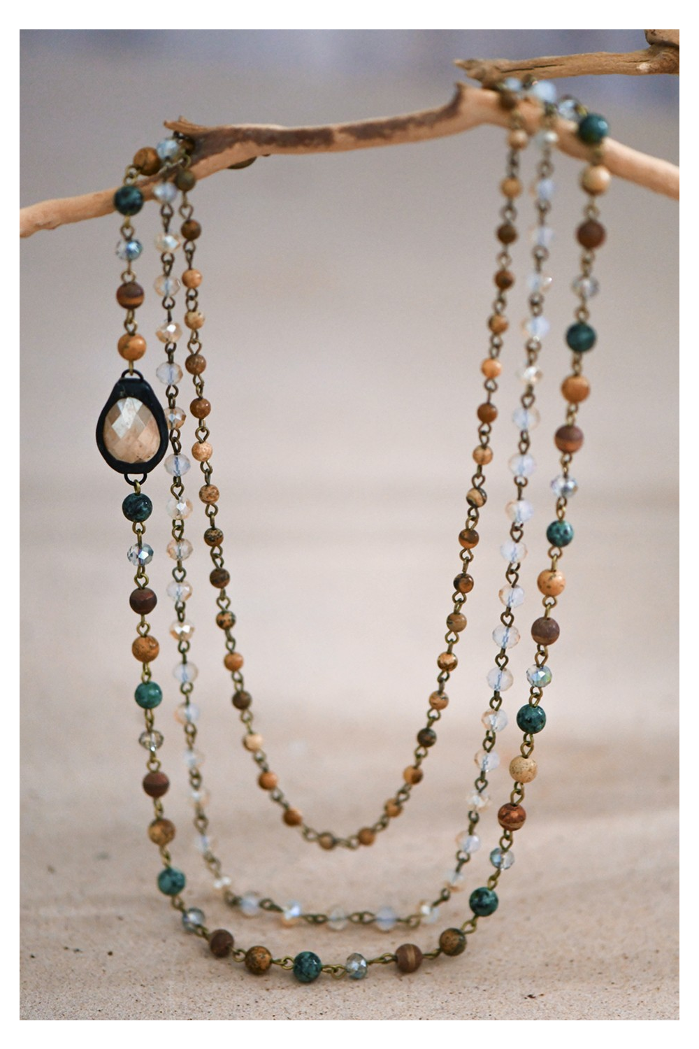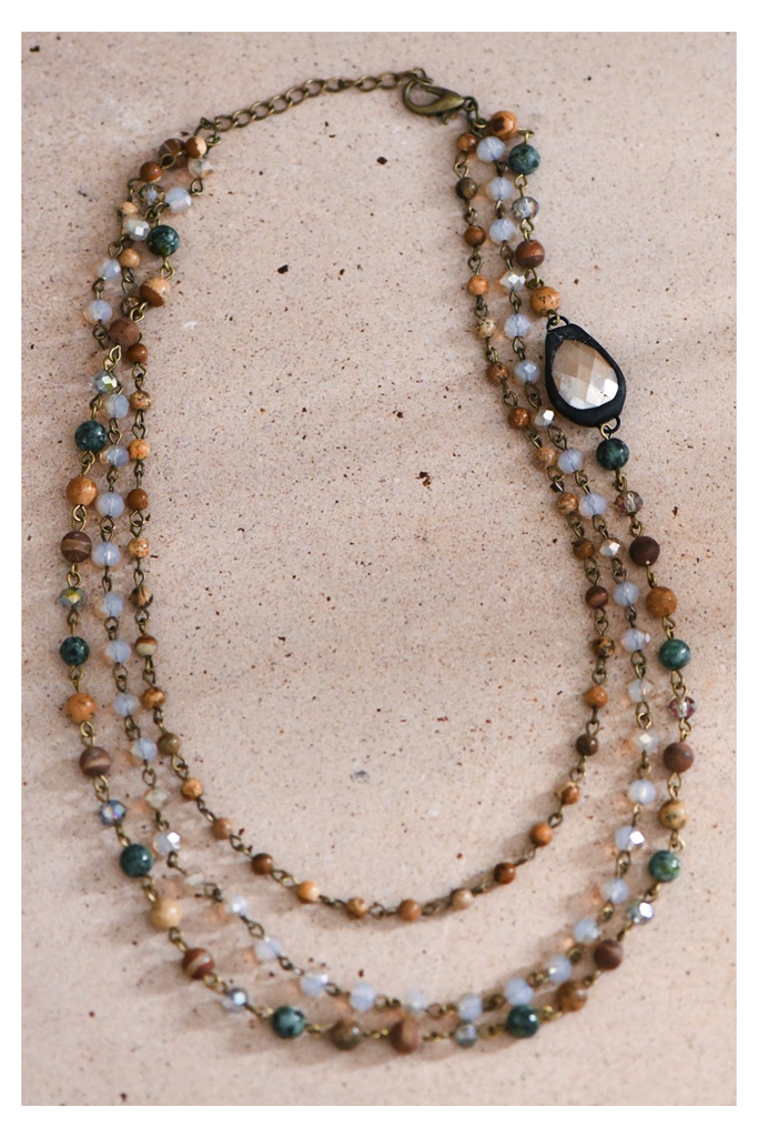 Triple Layered Mixed Glass Bead And Stone Necklace