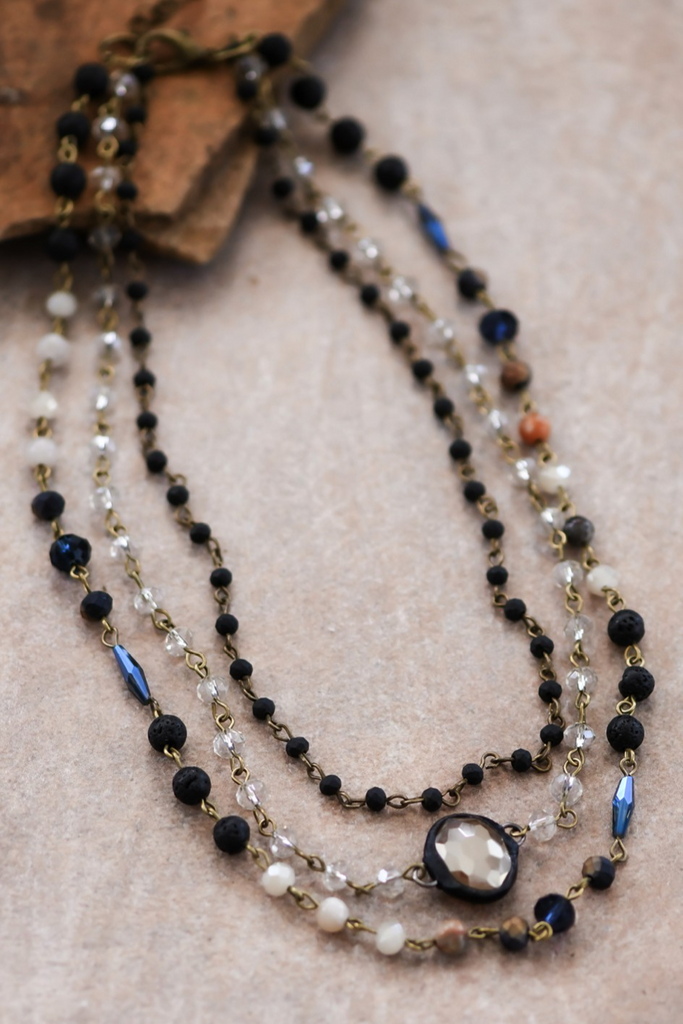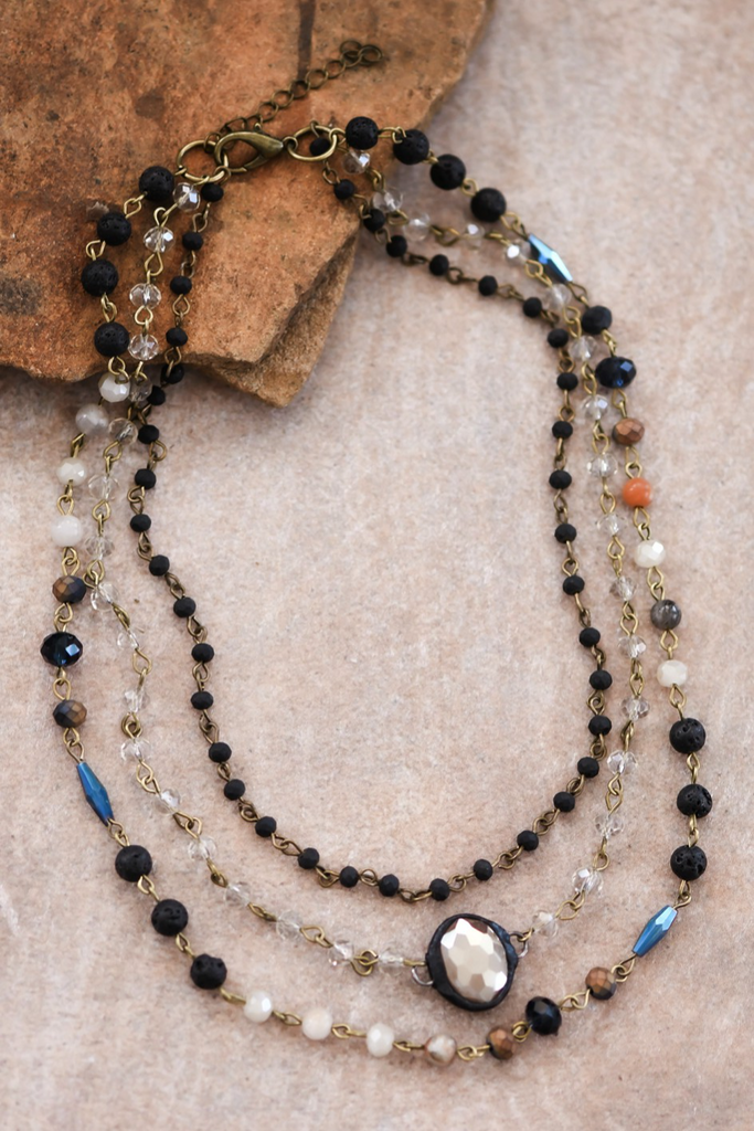Triple Layered Mixed Glass Bead And Stone Necklace