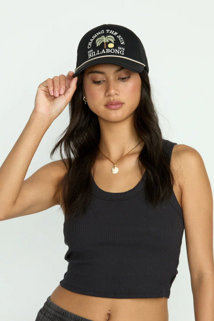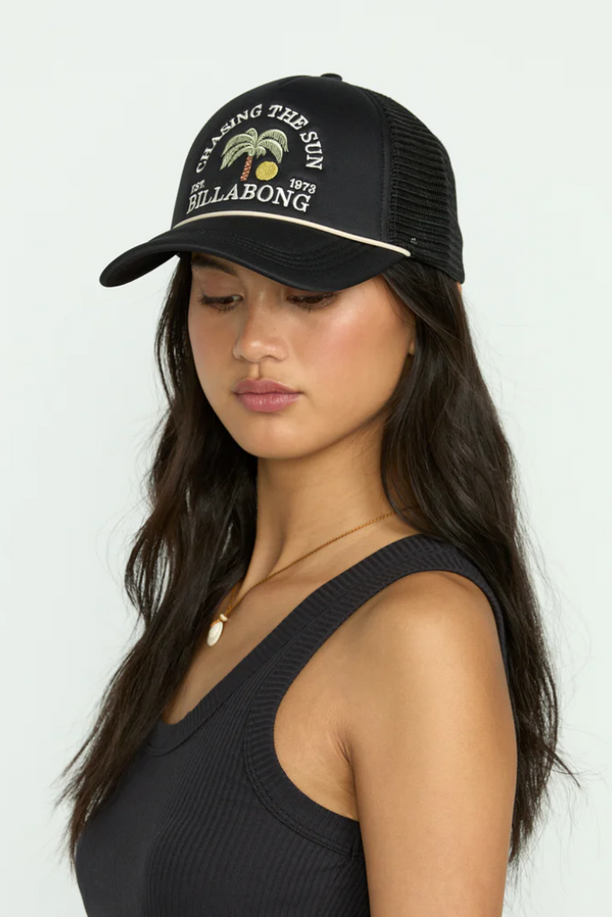 Our Billabong Across Waves trucker hat keeps rays at bay with its vintage-inspired style. This foam-fitted hat features an adjustable snapback and breathable mesh back for all-day comfort. Featured here in the Black colorway.