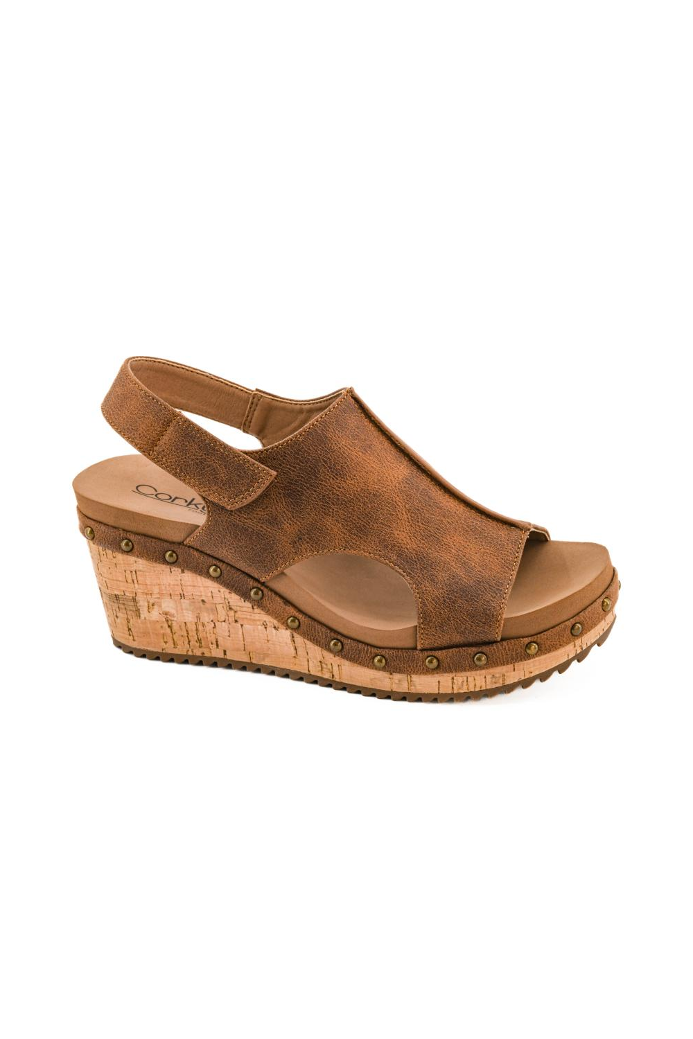 Elevate your everyday look with these bold black cork wedge sandals. Featuring a sleek faux leather upper, antique brass studs, and a comfy slingback strap, these wedges combine edgy flair with all-day comfort—perfect for pairing with anything from jeans to maxi dresses.