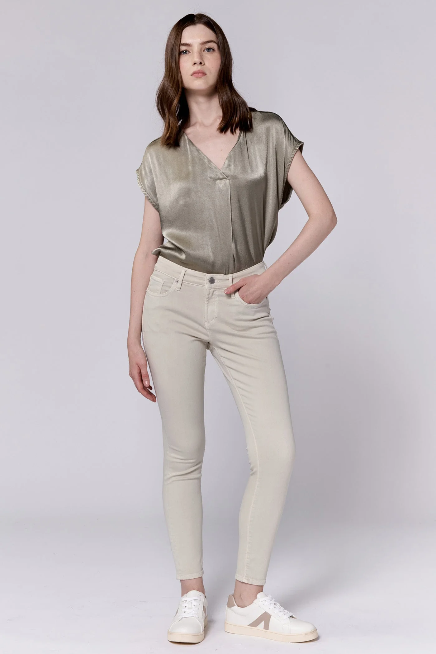 Delight in the Gisele mid rise ankle inseam jeans in colorful palettes, these are a stylish and essential addition to any fashion wardrobe. Designed with a flattering skinny cut in stretch twill that offers a contemporary fit, feature a clean hem for a polished look. Perfect for versatile outfits, they effortlessly transition from casual days to more formal occasions.