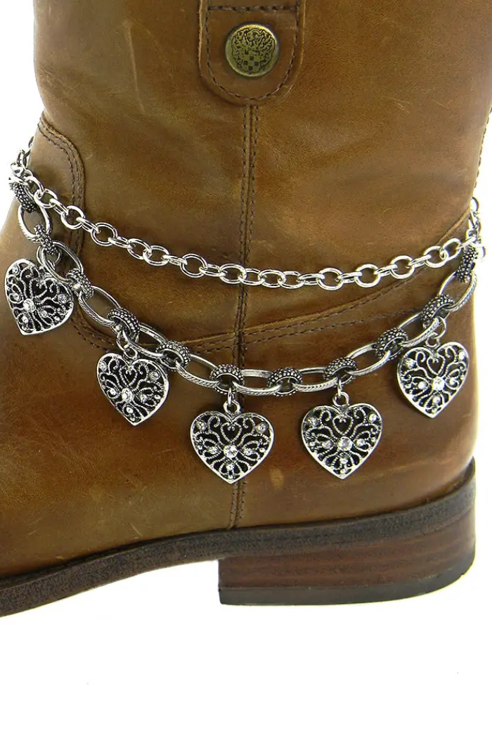A decorative boot chain featuring dangling filigree heart charms to dress up western or casual boots. The Heart Charm Boot Chain adds vintage-inspired metallic detail that wraps around the ankle of a boot for instant flair. This piece is offered by Western Elite Jewlrey and is designed as an easy clip-on charm accessory for footwear or other gear.