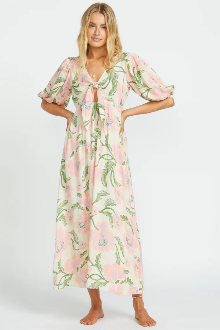 Billowy 100% viscose moss crepe swirls in this flirty boho maxi, detailed with flattering puff sleeves, a v-neck with tie, and cutout at the bodice. Breezy and romantic - perfect for chasing sunsets. Featured here in the Multi colorway.