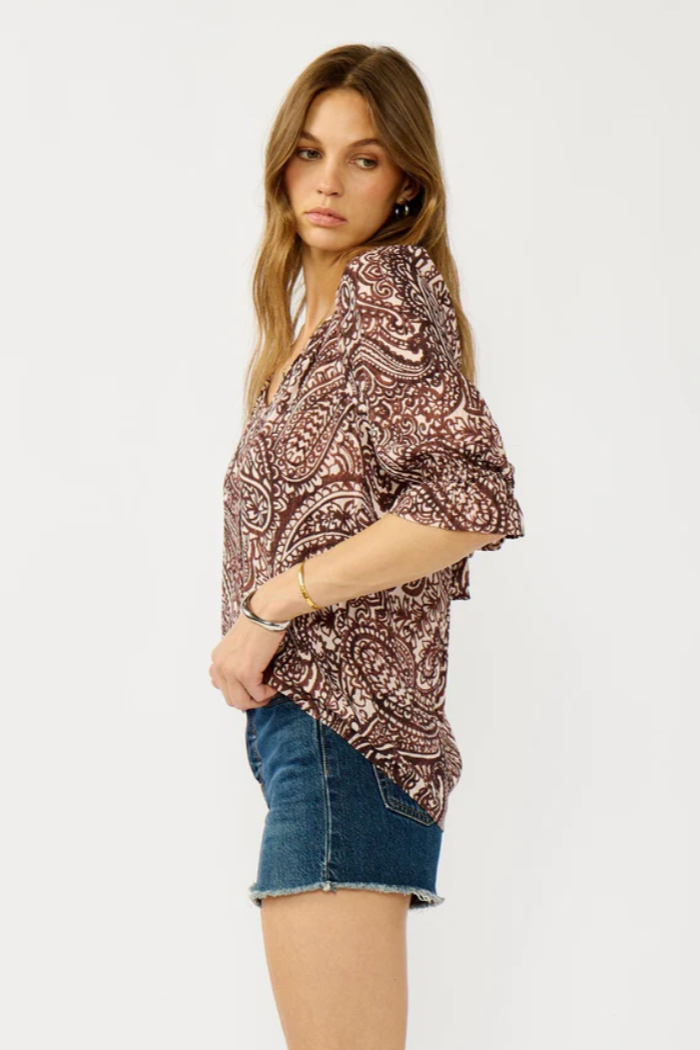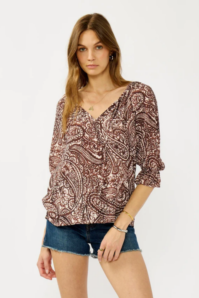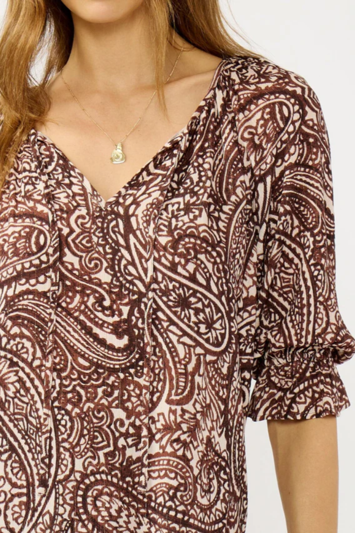 A bohemian top featuring a brown paisley print with metallic thread details.