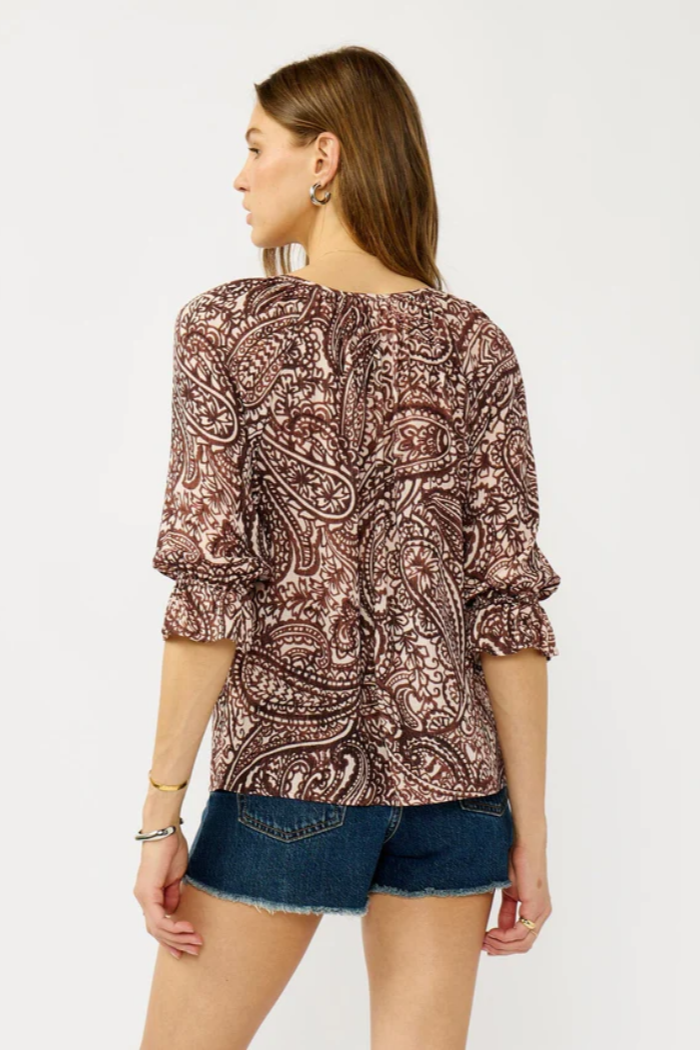 Ultra-boho and effortlessly flirty, this lightweight top is designed for easy, everyday style. Featuring a pretty brown paisley print woven with light-catching metallic threads to bring a subtle shimmer. The 3/4-length ruffle sleeves and chic split v-neckline add a relaxed yet feminine touch, making it perfect for pairing with your favorite denim for a fall-ready look.