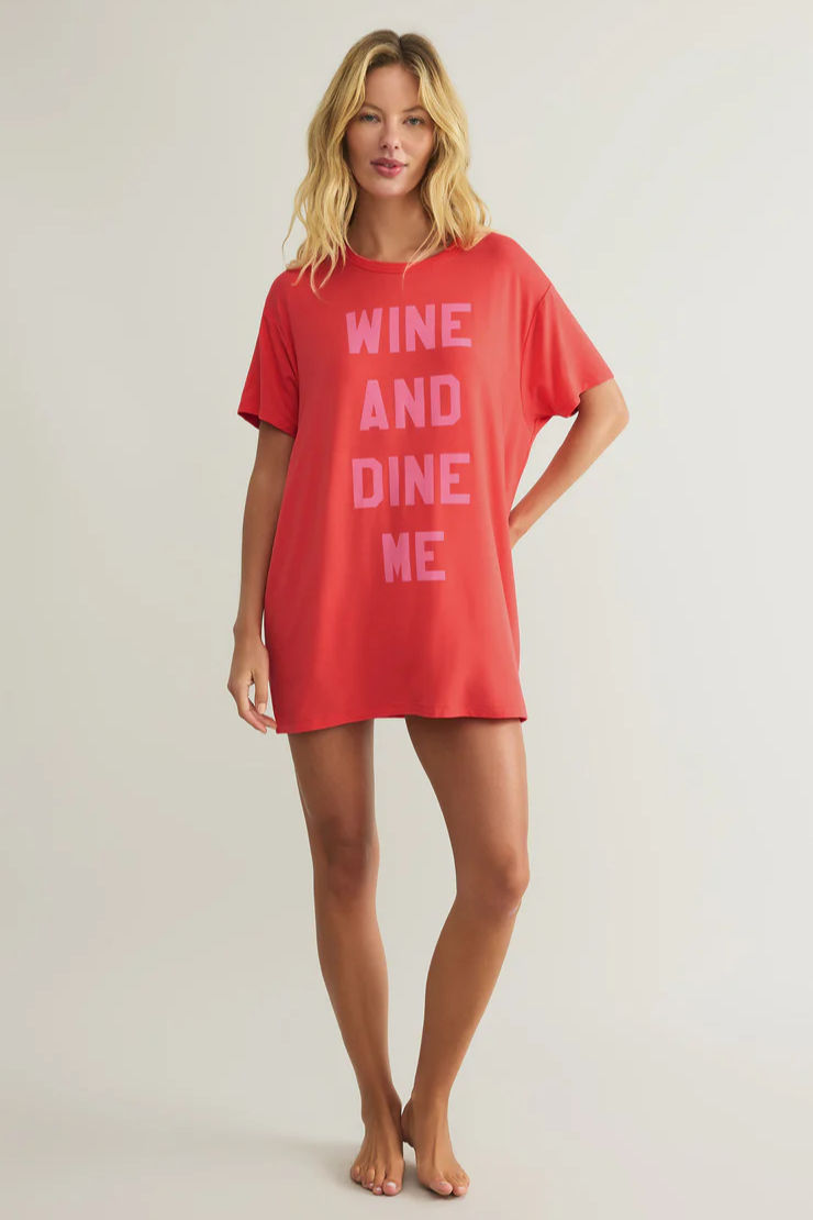 Unwind in ultimate comfort with this oversized crew neck tee featuring a playful "Wine and Dine Me" screen print graphic. Crafted from a buttery soft modal jersey blend, it’s perfect for sipping, lounging, and living your best relaxed life.